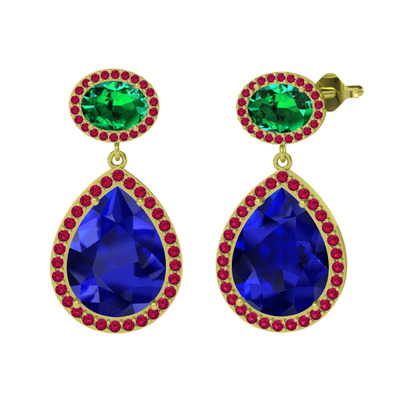 Lab safir, yeşil kuvars ve rodolit garnet 18 ayar altın küpe