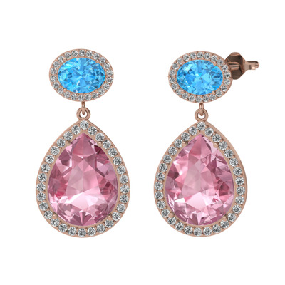 Pembe kuvars, akuamarin ve beyaz zirkon 8 ayar rose altın küpe