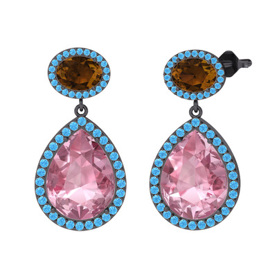 Pembe kuvars, dumanlı kuvars ve akuamarin 925 ayar siyah rodyum kaplama gümüş küpe