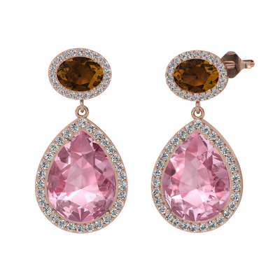 Pembe kuvars, dumanlı kuvars ve beyaz zirkon 14 ayar rose altın küpe