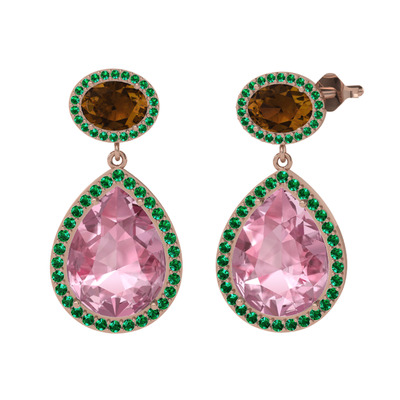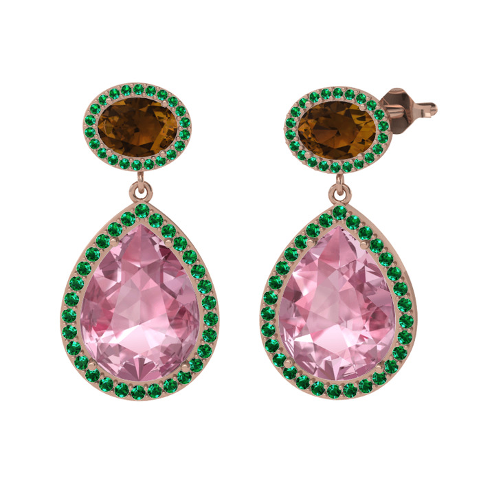 Pembe kuvars, dumanlı kuvars ve yeşil kuvars 925 ayar rose altın kaplama gümüş küpe