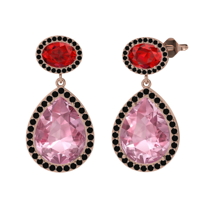 Pembe kuvars, garnet ve siyah zirkon 14 ayar rose altın küpe