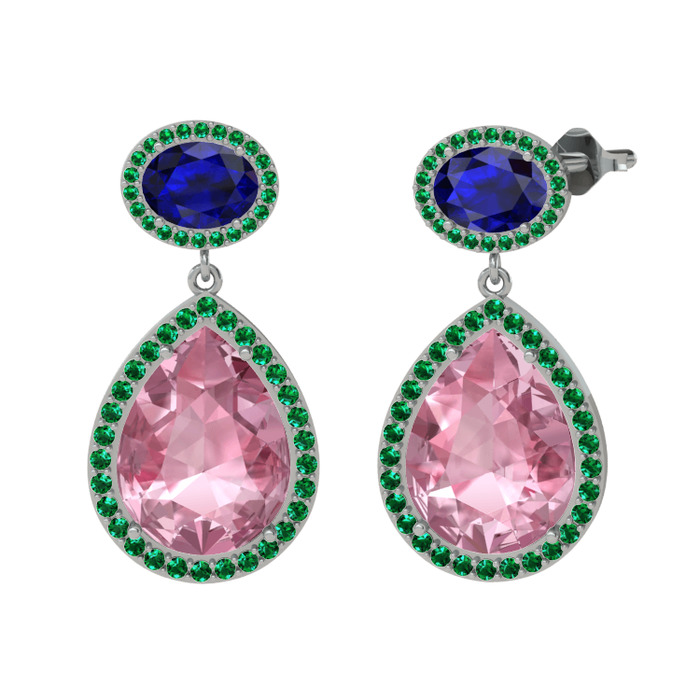 Pembe kuvars, lab safir ve yeşil kuvars 14 ayar beyaz altın küpe
