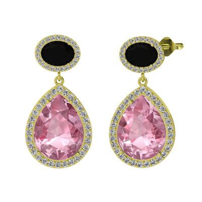 Pembe kuvars, siyah zirkon ve beyaz zirkon 925 ayar altın kaplama gümüş küpe