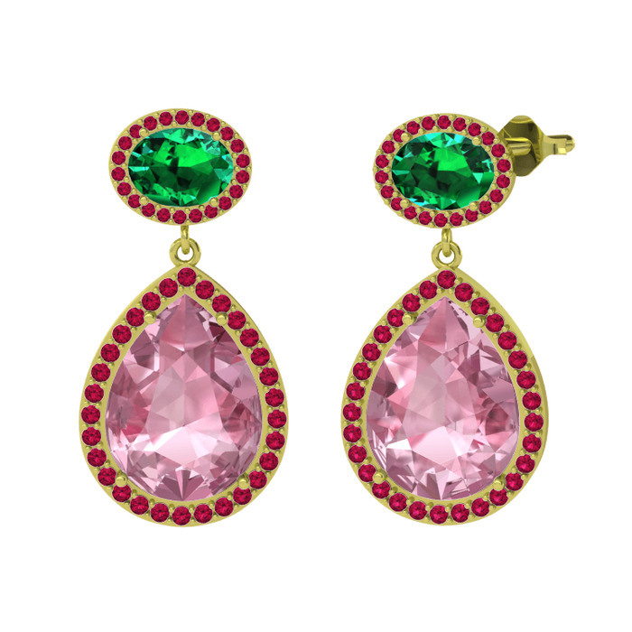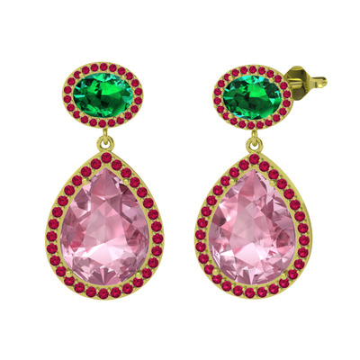 Pembe kuvars, yeşil kuvars ve rodolit garnet 14 ayar altın küpe