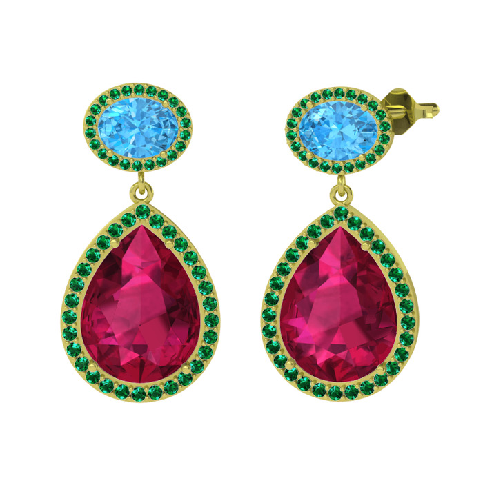 Rodolit garnet, akuamarin ve yeşil kuvars 8 ayar altın küpe