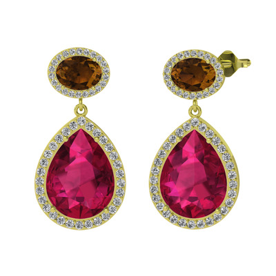 Rodolit garnet, dumanlı kuvars ve beyaz zirkon 925 ayar altın kaplama gümüş küpe