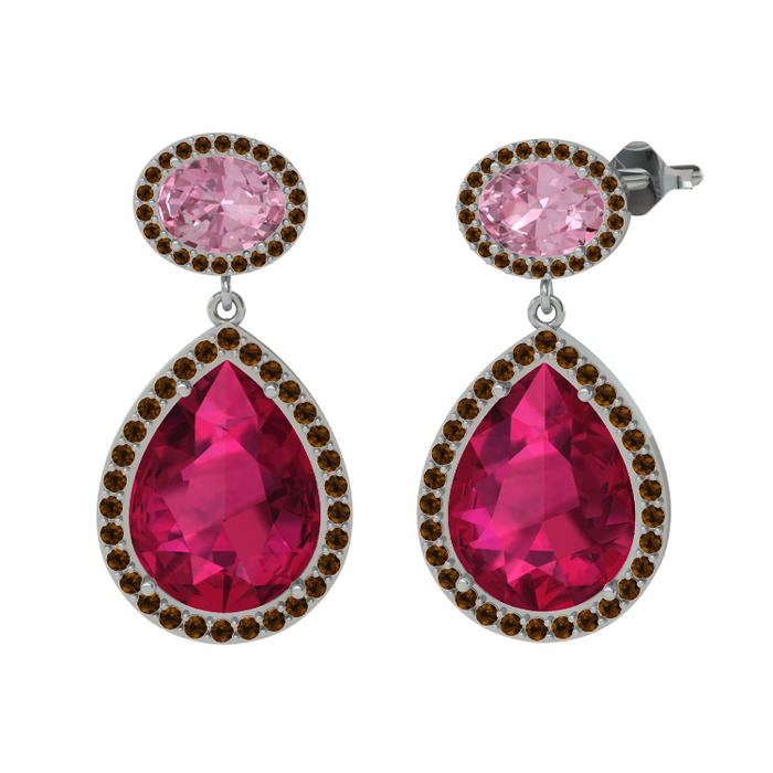 Rodolit garnet, pembe kuvars ve dumanlı kuvars 8 ayar beyaz altın küpe