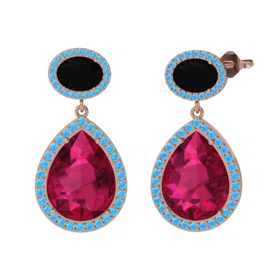 Rodolit garnet, siyah zirkon ve akuamarin 8 ayar rose altın küpe
