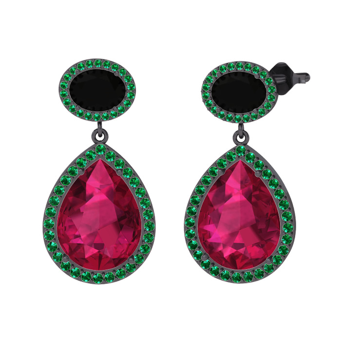 Rodolit garnet, siyah zirkon ve yeşil kuvars 925 ayar siyah rodyum kaplama gümüş küpe
