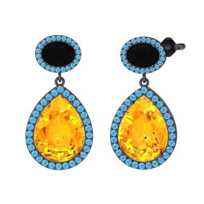 Sitrin, siyah zirkon ve akuamarin 925 ayar siyah rodyum kaplama gümüş küpe
