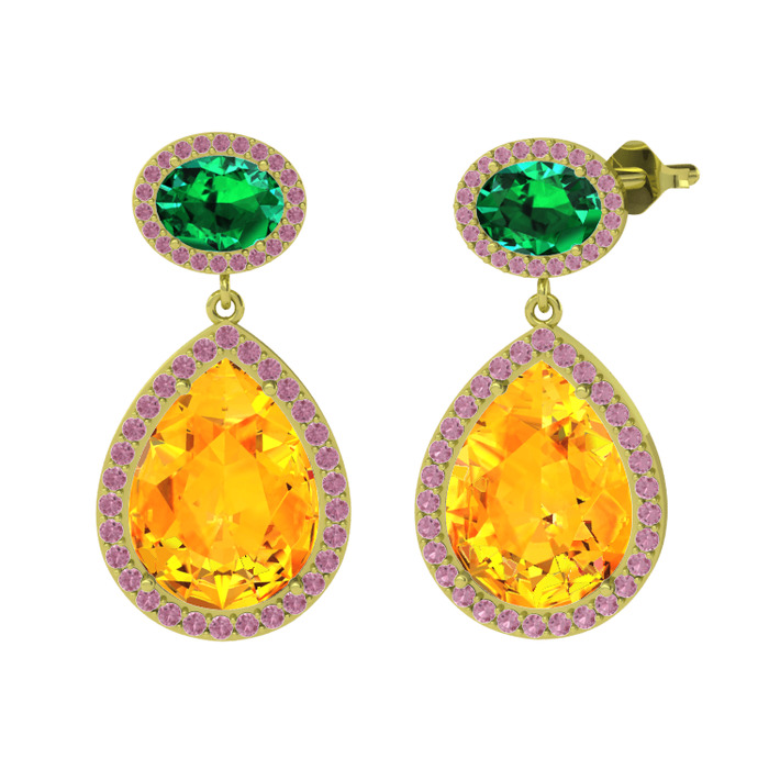 Sitrin, yeşil kuvars ve pembe kuvars 8 ayar altın küpe
