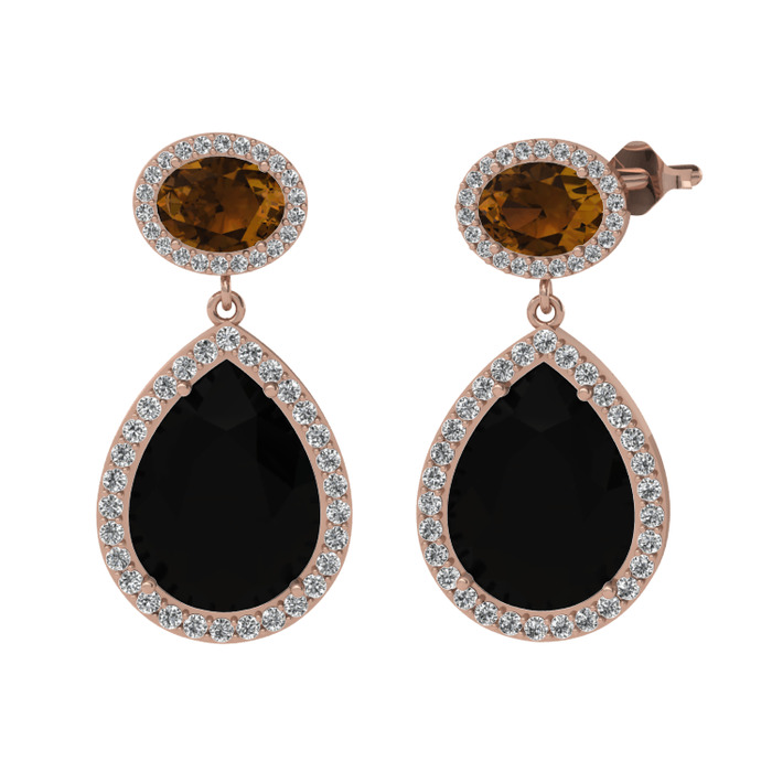 Siyah zirkon, dumanlı kuvars ve beyaz zirkon 14 ayar rose altın küpe