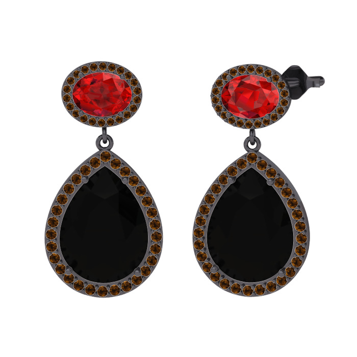 Siyah zirkon, garnet ve dumanlı kuvars 925 ayar siyah rodyum kaplama gümüş küpe