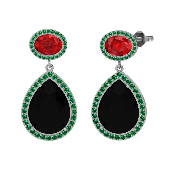 Siyah zirkon, garnet ve yeşil kuvars 8 ayar beyaz altın küpe