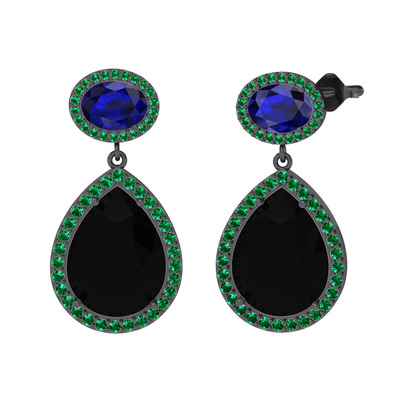 Siyah zirkon, lab safir ve yeşil kuvars 925 ayar siyah rodyum kaplama gümüş küpe
