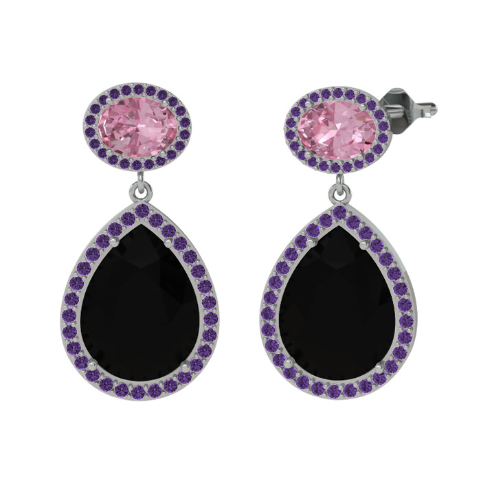 Siyah zirkon, pembe kuvars ve ametist 14 ayar beyaz altın küpe