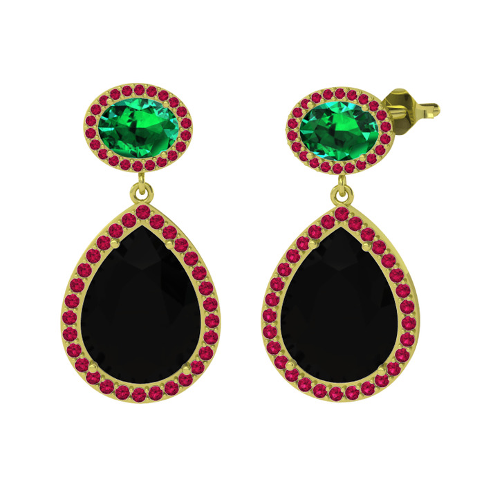 Siyah zirkon, yeşil kuvars ve rodolit garnet 14 ayar altın küpe