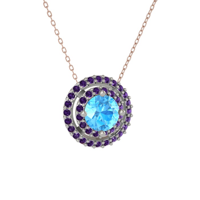 Akuamarin ve ametist 18 ayar beyaz altın kolye (40 cm rose altın rolo zincir)