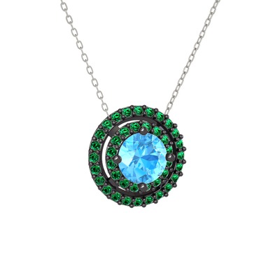 Akuamarin ve yeşil kuvars 925 ayar siyah rodyum kaplama gümüş kolye (40 cm beyaz altın rolo zincir)