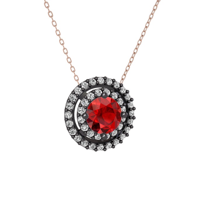 Garnet ve beyaz zirkon 925 ayar siyah rodyum kaplama gümüş kolye (40 cm rose altın rolo zincir)
