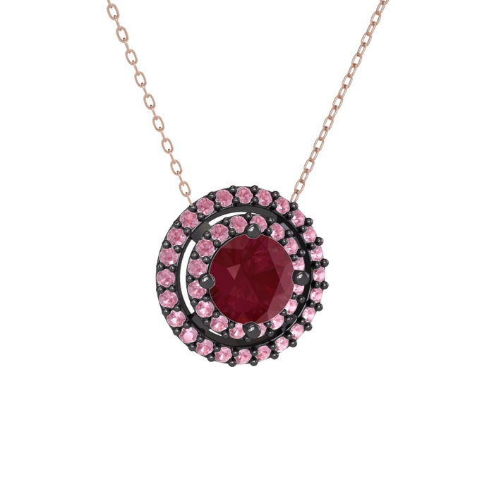 Kök yakut ve pembe kuvars 925 ayar siyah rodyum kaplama gümüş kolye (40 cm rose altın rolo zincir)