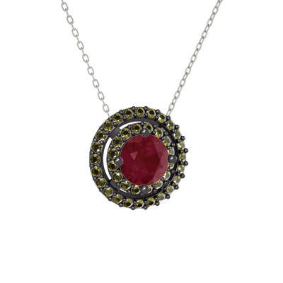 Kök yakut ve peridot 925 ayar siyah rodyum kaplama gümüş kolye (40 cm beyaz altın rolo zincir)
