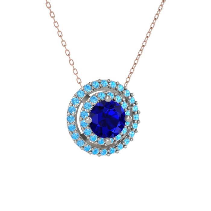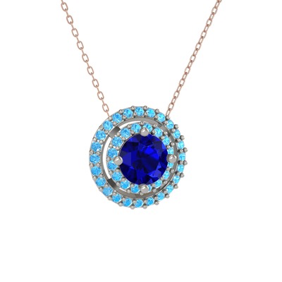 Lab safir ve akuamarin 14 ayar beyaz altın kolye (40 cm gümüş rolo zincir)