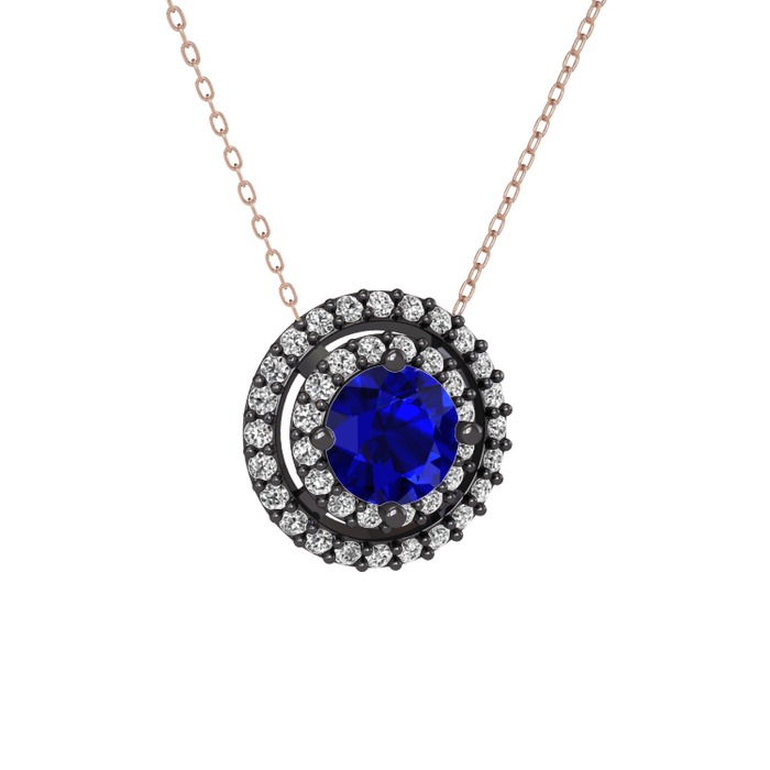 Lab safir ve beyaz zirkon 925 ayar siyah rodyum kaplama gümüş kolye (40 cm rose altın rolo zincir)