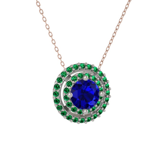 Lab safir ve yeşil kuvars 14 ayar beyaz altın kolye (40 cm rose altın rolo zincir)