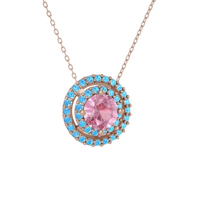 Pembe kuvars ve akuamarin 8 ayar rose altın kolye (40 cm rose altın rolo zincir)