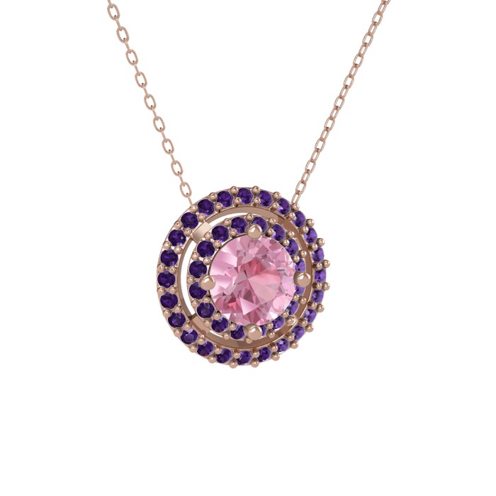 Pembe kuvars ve ametist 14 ayar rose altın kolye (40 cm gümüş rolo zincir)