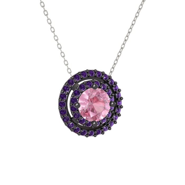 Pembe kuvars ve ametist 925 ayar siyah rodyum kaplama gümüş kolye (40 cm beyaz altın rolo zincir)