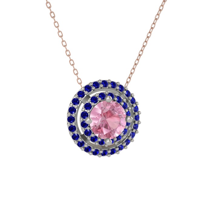 Pembe kuvars ve lab safir 8 ayar beyaz altın kolye (40 cm rose altın rolo zincir)