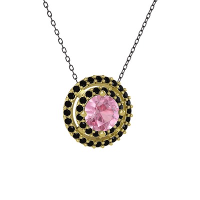 Pembe kuvars ve siyah zirkon 14 ayar altın kolye (40 cm gümüş rolo zincir)