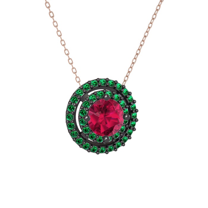 Rodolit garnet ve yeşil kuvars 925 ayar siyah rodyum kaplama gümüş kolye (40 cm rose altın rolo zincir)