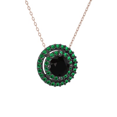 Siyah zirkon ve yeşil kuvars 925 ayar siyah rodyum kaplama gümüş kolye (40 cm rose altın rolo zincir)