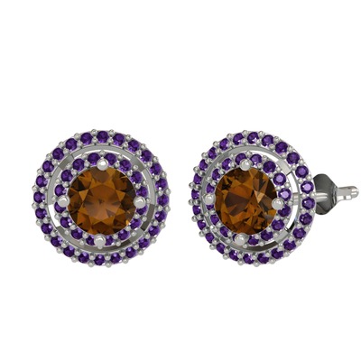 Dumanlı kuvars ve ametist 18 ayar beyaz altın küpe