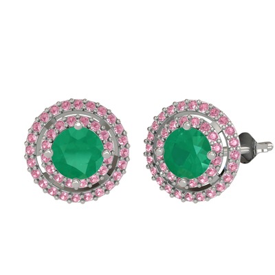 Kök zümrüt ve pembe kuvars 18 ayar beyaz altın küpe