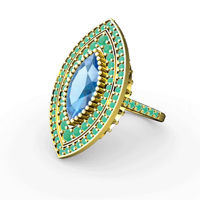 Akuamarin ve kök zümrüt 925 ayar altın kaplama gümüş yüzük