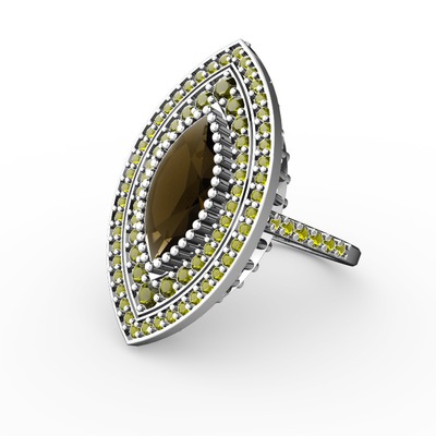 Dumanlı kuvars ve peridot 18 ayar beyaz altın yüzük