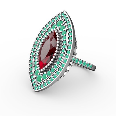 Garnet ve kök zümrüt 18 ayar beyaz altın yüzük