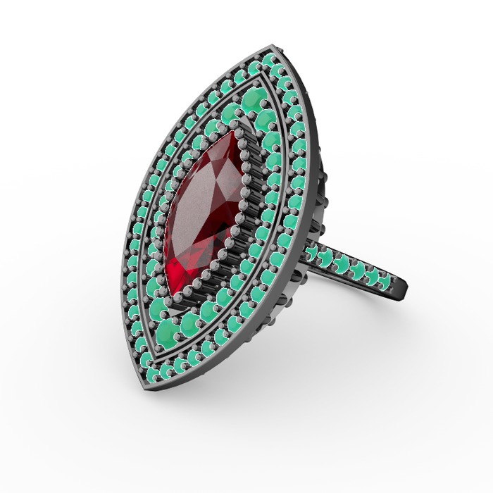 Garnet ve kök zümrüt 925 ayar siyah rodyum kaplama gümüş yüzük