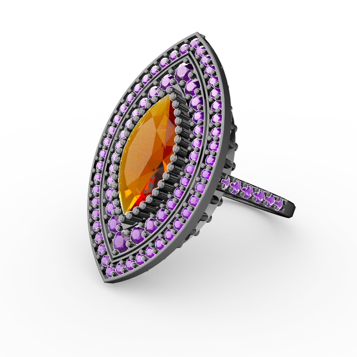Sitrin ve ametist 925 ayar siyah rodyum kaplama gümüş yüzük