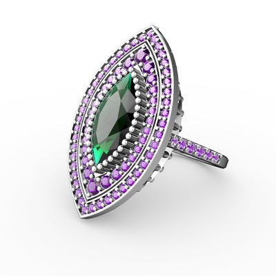 Yeşil kuvars ve ametist 18 ayar beyaz altın yüzük