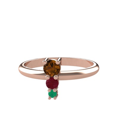 Dumanlı kuvars, kök yakut ve kök zümrüt 925 ayar rose altın kaplama gümüş yüzük