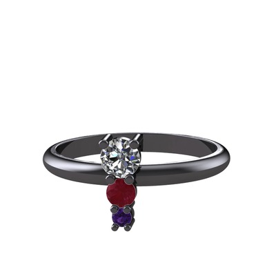 Pırlanta, kök yakut ve ametist 925 ayar siyah rodyum kaplama gümüş yüzük (0.18 karat)