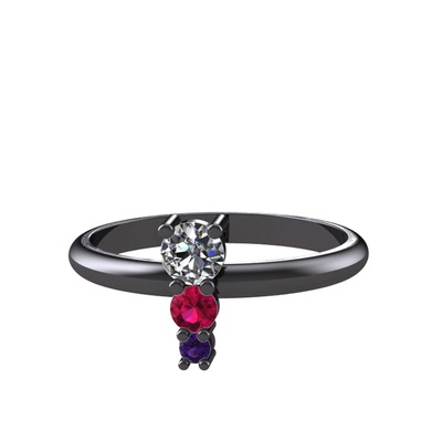 Pırlanta, rodolit garnet ve ametist 925 ayar siyah rodyum kaplama gümüş yüzük (0.18 karat)