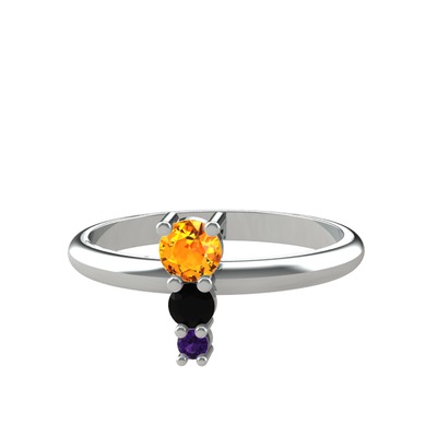 Sitrin, siyah zirkon ve ametist 14 ayar beyaz altın yüzük