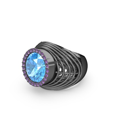 Akuamarin ve ametist 925 ayar siyah rodyum kaplama gümüş yüzük